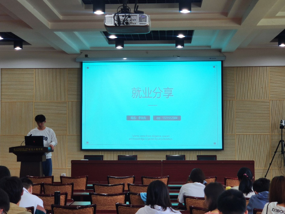 已经获得入职机会的李运庆同志,介绍了就业的具体流程和准备工作,分享了自己准备过程中积累的经验,他建议大家要认真准备突出自身优势和特点的简历,提前设计适合自己的职业生涯规划,通过多种渠道寻找实习和就业相关信息,有针对性地投递简历。分享结束后,正在准备就业的同学们提出疑问,李运庆同志根据自己的经历给出了相关建议。